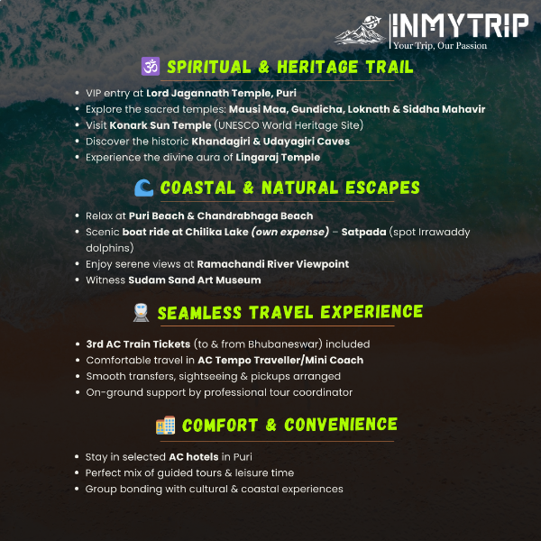 Embark on a soulful 5N/6D pilgrimage journey with inmytrip.com from Bilaspur to the sacred land of Puri. Experience the divine aura of Lord Jagannath’s darshan with VIP entry, explore the iconic Konark Sun Temple, serene Chandrabhaga Beach, and the artistic marvels of Odisha. Sail through the enchanting waters of Chilika Lake, witness temples steeped in history at Bhubaneswar, and stroll along Puri Beach. With comfortable train travel, guided sightseeing, and curated experiences, this fixed departure tour blends spirituality, culture, and natural beauty—offering memories of devotion, peace, and discovery that will stay with you forever.